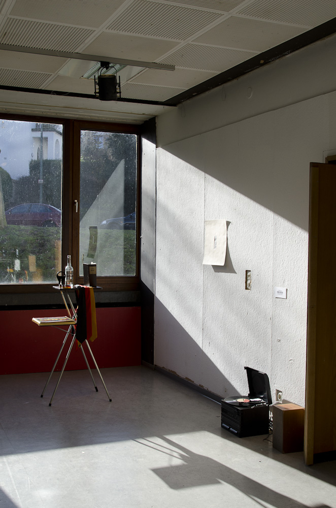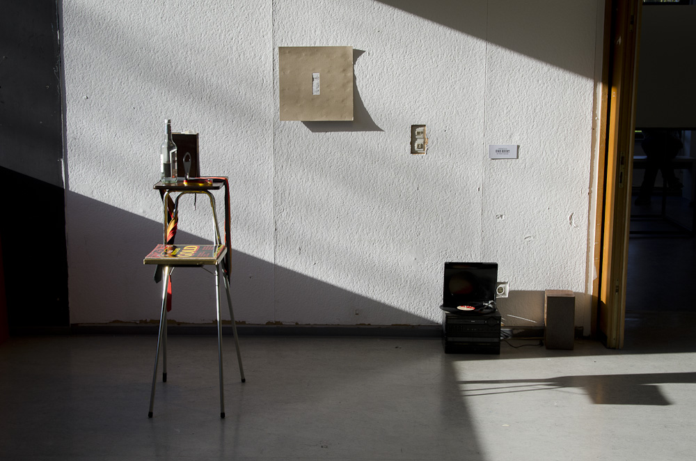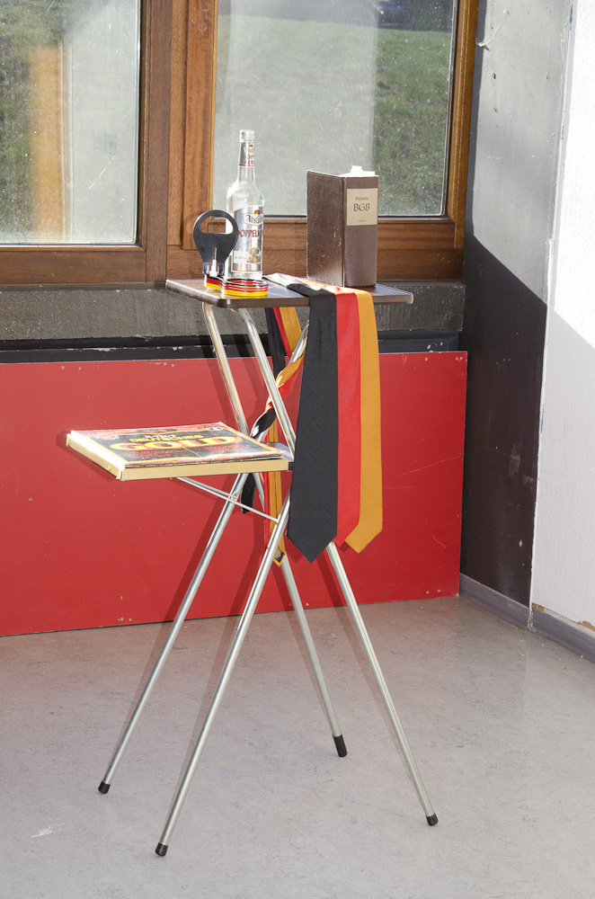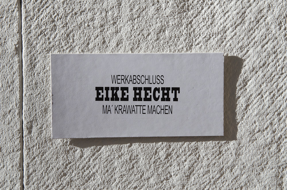 Ausgehend vom Symbol formaler Kleidung – der Krawatte – entwickelt Eike Hecht eine assoziative Objektsammlung zur neueren deutschen Geschichte. Schwarz-rot-goldene Dinge präsentieren sich mit Augenzwinkern, Schnaps und Berufung auf das BGB von 1951, dazu spielt ein Plattenspieler mit nur einem (rechten) Lautsprecher Schlager am laufenden Band. Die Arbeit provoziert klanglich und auf der Objektebene, die beigefügte Theoriearbeit – ein Kassenbon über 10 Euro aus einem Recycling-Laden – bietet nur einen vagen Einstieg in die Materie.