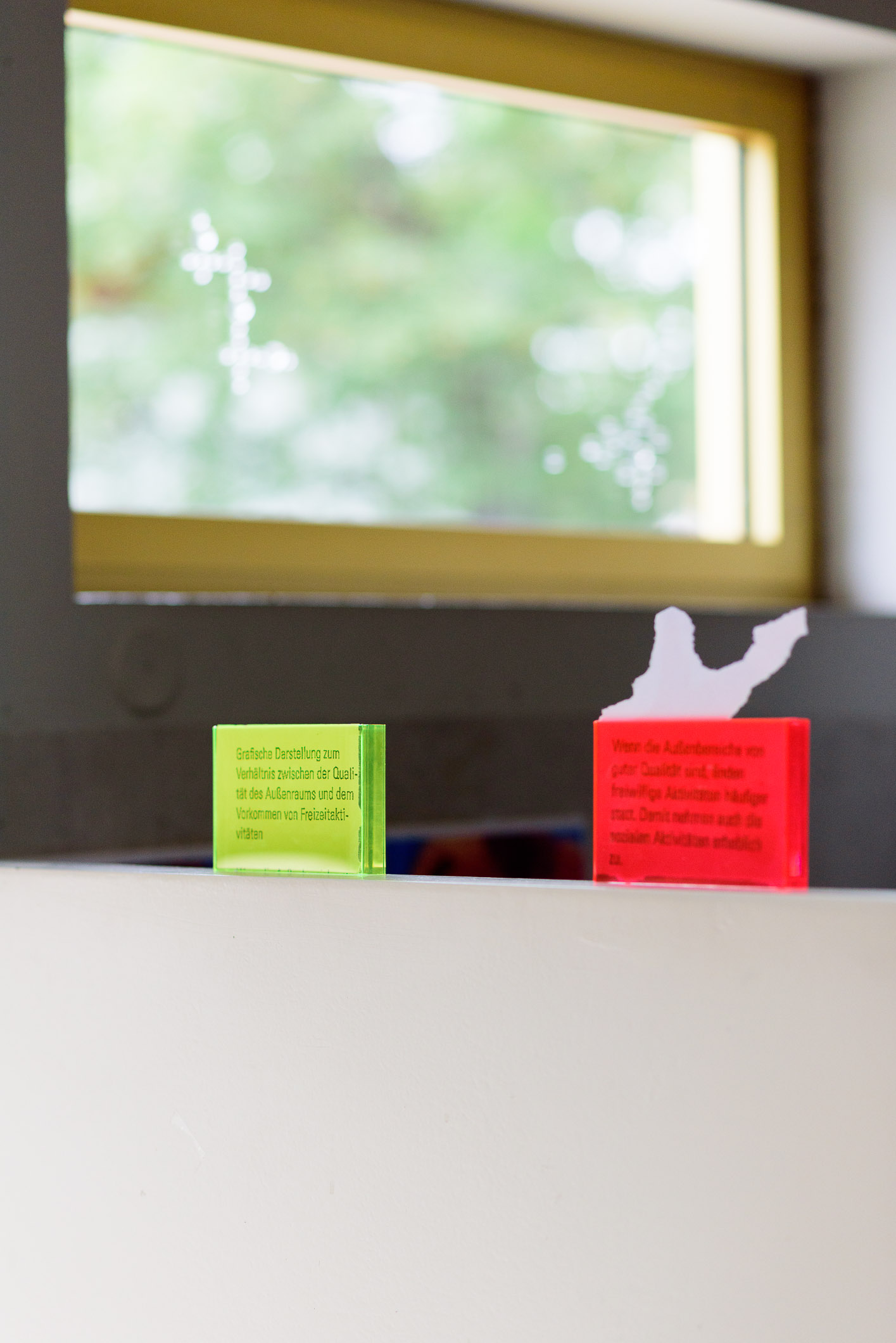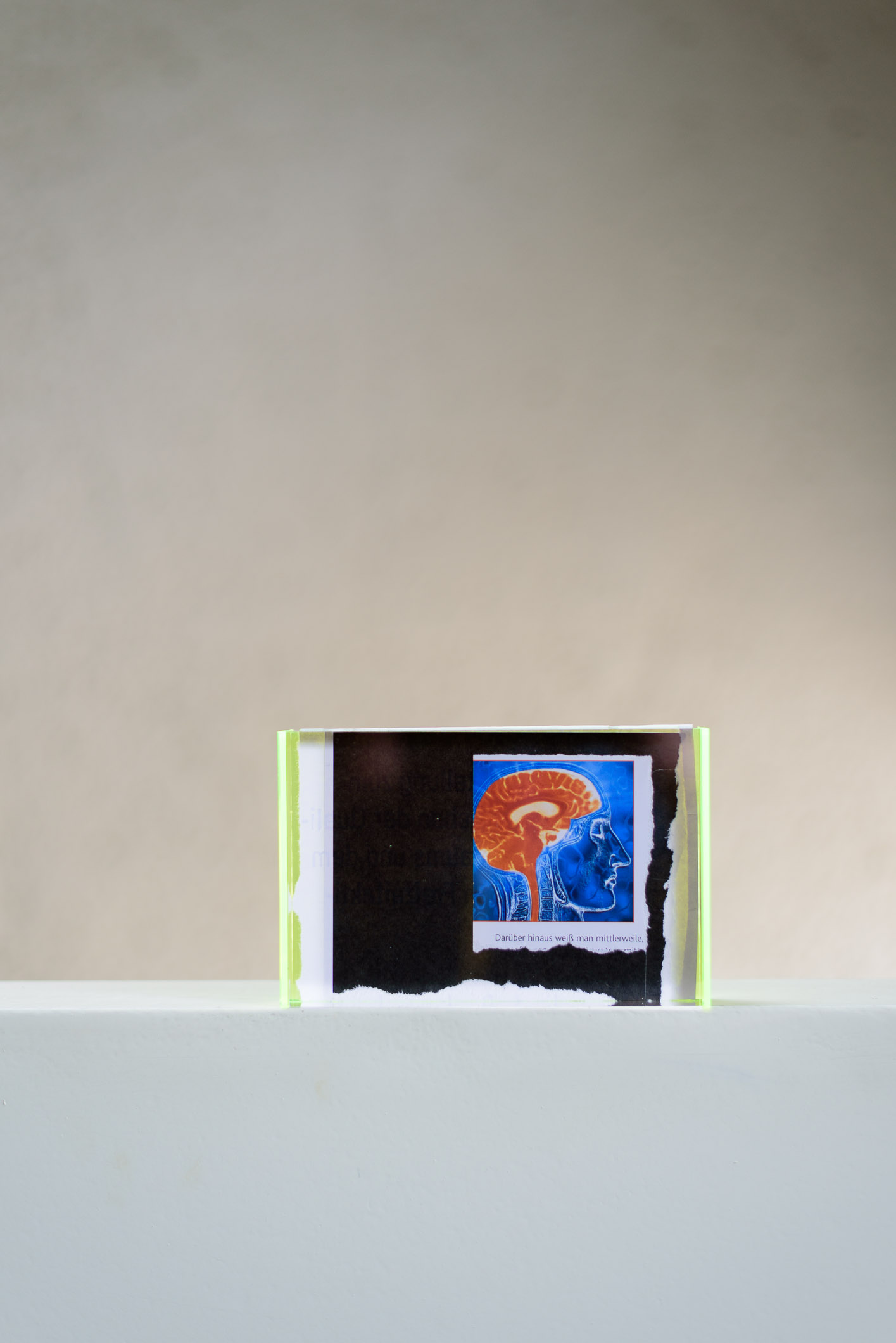Textfragmente verweisen auf den Zusammenhang zwischen Habitatqualität und Verhaltensstörungen. Ein kleines gerahmtes Objekt schließlich steht wie ein Memento für die menschliche Verantwortung: Ein Menschengehirn mit der mantraartigen Textergänzung „Darüber hinaus weiß man mittlerweile,“.